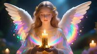 De foto toont een engel met majestueuze, open vleugels die zachtjes een flikkerende kaars vasthoudt. De engel is gehuld in delicate, lichtdoorstroomde gewaden die de gratie en het etherische karakter van het wezen levendig benadrukken. De vleugels reiken tot ver in de lucht en tonen fijne details van de verenstructuur die glinsteren in…