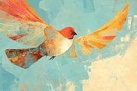 Vleugels | Vogel Schilderij | Winged Spectrum - Dit vogel schilderij toont een abstracte, kleurrijke vogel in vlucht, uitgebeeld met heldere, geometrische vleugels tegen een zachtblauwe achtergrond.