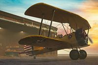 Het beeld wordt versterkt door de pilote, wiens haren wapperen in de wind van de propeller. Je kunt de opwinding en energie van het moment voelen terwijl ze vooruitkijkt naar de zon die langzaam ondergaat aan de horizon. Het creëert een gevoel van sereniteit en verwondering.