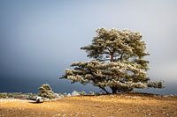 Een schitterende winterse landschapsfoto van een vrijstaande vliegden of grove den op een zandverstuiving op de Drentse Hondsrug. Op de achtergrond een dreigende lucht met (sneeuw)buien. De berijpte grove den en zandvlakte worden mooi belicht door het zonlicht dat zich enkele seconden liet zien.