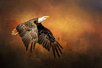 Vliegende Amerikaanse zeearend met een mooie, dreigende rood, bruin en oranje wolkenlucht