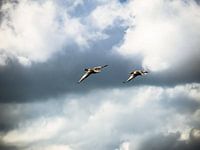 Vliegende ganzen door de lucht met als achter grond grauwe wolken.