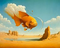Ontdek het surrealistische schilderij 'Vliegende Goudvis' - een verbluffend schilderij waarin een gouden vis door de lucht vliegt in een droomachtige wereld vol verbeeldingskracht.