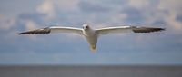 Adulte Jan-van-gent in de vlucht boven de Noordzee vanaf een schip tijdens een pelagische tocht voor de kust van Zeeland