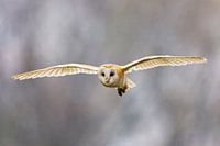 Kerkuil (Tyto alba) vliegend overdag in Nederland.