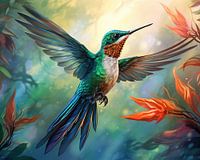 Vliegende Kolibrie - Centraal op het doek prijkt een dynamische kolibrie in vlucht, zijn veren pronken met een levendig palet van turkooise en smaragdgroene tinten, terwijl zachte oranjes en warme gouden lichten de achtergrond een etherische uitstraling geven. De stijl van het schilderij is realistisch met een vleugje magie, een…