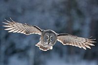 Vliegende Laplanduil (Strix nebulosa) in Finland.