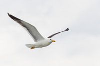 Mantelmeeuw in vlucht. Deze meeuw vloog op zee in de buurt van Texel een van de waddeneilanden. Een kleine mantelmeeuw vliegend met als achtergrond een grijs wolkendek waardoor er een minimalistisch beeld ontstaat.