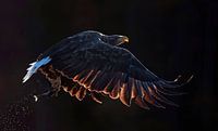 Vliegende Zeearend (Haliaeetus albicilla) met prooi met tegenlicht in Noorwegen.