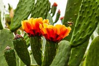 Een bij is op zoek naar stuifmeel op de bloemen van een cactus