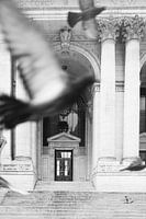 Zwart wit foto van een groep vliegende duiven bij het gebouw New York Public Library in Manhattan.