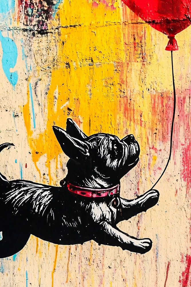 Dit unieke kunstwerk combineert de energie van street art met een speelse en kleurrijke uitstraling. Het toont een vliegende hond die aan een rode ballon hangt, op een achtergrond van levendige tinten en abstracte patronen. Het ontwerp straalt dynamiek en vrolijkheid uit, perfect om een eigentijdse ruimte mee te verfraaien. Ideaal voor liefhebbers van moderne kunst en dieren, dit schilderij voegt een speelse twist toe aan elke woonkamer, kantoor of hobbykamer. De heldere kleuren en het dynamische ontwerp maken het een eyecatcher in elk interieur.