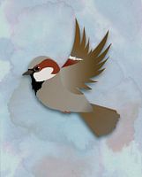 Een digitale vector illustratie van een vliegende huismus. De achtergrond is in zachte koele kleuren en zijn waterverfvlekken, die mooi contrasteren met het vogeltje. Mooi grafisch plaatje