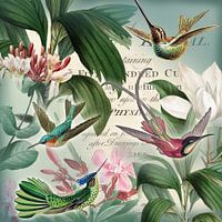 Kolibries worden ook wel "Flying Jewels" genoemd, vandaar de titel van de foto. Hier zijn vier prachtige exemplaren tegen een achtergrond van verschillende historische plantenillustraties, gecombineerd met een oude boekpagina en kleurverlopen.