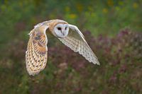 Vliegende kerkuil over een veld met bloemen. van Albert Beukhof