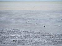 Bij de Waddenzee van Terschelling onder de dijk vliegen en foerageren lepelaars.