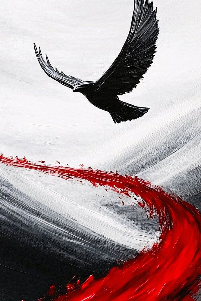 Dit intrigerende kunstwerk toont een zwarte vogel die majestueus boven een golvend landschap zweeft. Het contrast tussen de donkere vogel en de rode strook die door het landschap slingert, geeft een gevoel van dynamiek en kracht. De vloeiende lijnen en de subtiele tinten in de achtergrond creëren een serene sfeer, terwijl de rode kleur een dramatisch accent toevoegt. Dit werk is een perfecte aanvulling op een moderne woonkamer of kantoorruimte, waar het de ruimte kan vullen met energie en diepte. Een echte blikvanger voor liefhebbers van abstracte kunst met een minimalistische uitstraling.