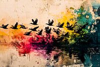 Dit kunstwerk toont een levendige vlucht vogels die gracieus over kleurrijk water bewegen. Het ontwerp combineert silhouetten van vogels met dynamische, abstracte kleuren en reflecties, wat een fascinerende sfeer creëert. De rijke kleuren en abstracte stijl maken dit een opvallend decorstuk, perfect om elke ruimte een levendig en artistiek karakter te geven. Ideaal voor moderne interieurs of ruimtes waar een vleugje energie gewenst is, zoals een woonkamer of eetkamer. Dit ontwerp straalt beweging en vrijheid uit en is een unieke toevoeging aan je interieur.