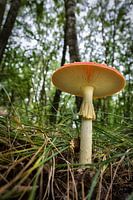 Macro/groothoek opname van een prachtige vliegenzwam met rok tussen het lange groene gras in het bos bij Drunen, Nederland. Door het lage standpunt is de onderkant van de hoed van deze paddenstoel goed te zien en zijn de lamellen goed zichtbaar.