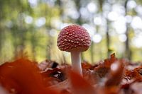 Vliegenzwam, rood met wit, in het bos met een mooie bokeh er achter door het licht wat door de bomen valt. De bomen kun je vaag onderscheiden waardoor je toch een gevoel van bos krijgt waar de paddestoel in staat.