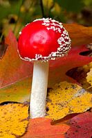 De vliegenzwam ( Amanita muscaria ) is een opvallende rode paddenstoel met witte stippen, die algemeen voorkomt in de lage landen