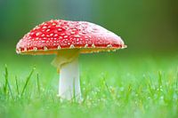 Een vliegenzwam op een industrieterrein, genomen met de camera net boven de grond, om zo op 'ooghoogte' te komen met deze schoonheid. De druppeltjes dauw in het gras geven de foto een frisse uitstraling.