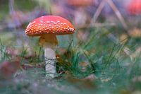 Vliegenzwam paddenstoel gefotografeerd met geringe scherptediepte om de focus op de paddenstoel te leggen en de achtergrond vaag te houden.