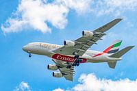 Airbus A380-800 vliegtuig van Emirates, de grootste exploitant van het grootste passagiersvliegtuig. De Airbus A380 is 's werelds grootste passagiersvliegtuig en het enige dubbeldeksvliegtuig van volledige lengte. Het landingsgestel is uit terwijl het vliegtuig op lage hoogte vliegt.