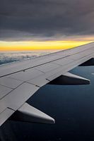 Een vliegtuig vliegt tijdens zonsopkomst zijn bestemming tegemoet. De vleugel van het vliegtuig is prominent in beeld maar geeft de foto de juiste sfeer mee van vakantie, dromen en reizen. Een prachtige kleur verschijnt aan de horizon, boven de wolken, een heel bijzonder gezicht. Onder ons bevindt zich de oceaan, die langzaam zichtbaar…