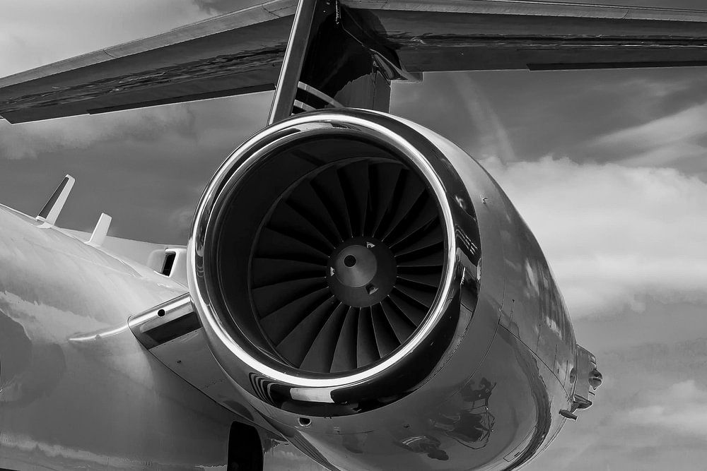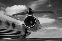 Vleugel van een zakenvliegtuig met motor. Foto is gemaakt op Schiphol.