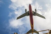 Flugzeug bei der Landung. Ein Airbus A300 bei der Landung in Schiphol, Amsterdam. Das Flugzeug befindet sich kurz vor dem Aufsetzen auf dem Boden.