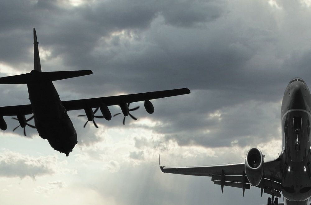 Twee vliegtuigen het oude model vliegt weg het nieuwe model komt ons tegemoet , deze in silhouet weergegeven