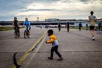 Jongentje rent rond op het Berlijnse vliegveld Tempelhof. Vroeger het vliegveld van Berlijn, tegenwoordig een stadspark.
