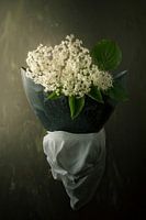 De bloesem van een vlierbes in een mooi gevormde vaas. Een stilleven dat lijkt te zweven in zijn omgeving, de vorm van het kleed versterkt het model van de vaas, de bloesem en het blad vullen de vaas aan de bovenzijde. Het beeld is overwegend groen en in een natuurlijke balans met de gele en witte tinten.