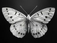 In deze zwart-wit afbeelding rust een vlinder met gespreide vleugels stil tegen een neutrale dinkere achtergrond. De vleugels tonen een patroon van lijnen en stippen, die in het monochrome palet een grafisch, bijna tekenachtig karakter krijgen. Elk detail is scherp, van de fluweelachtige textuur tot de fijne rand van zijn vleugels.…