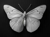 In deze zwart-wit afbeelding rust een vlinder met gespreide vleugels stil tegen een neutrale dinkere achtergrond. De vleugels tonen een patroon van lijnen en stippen, die in het monochrome palet een grafisch, bijna tekenachtig karakter krijgen. Elk detail is scherp, van de fluweelachtige textuur tot de fijne rand van zijn vleugels.…