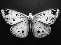 In deze zwart-wit afbeelding rust een vlinder met gespreide vleugels stil tegen een neutrale dinkere achtergrond. De vleugels tonen een patroon van lijnen en stippen, die in het monochrome palet een grafisch, bijna tekenachtig karakter krijgen. Elk detail is scherp, van de fluweelachtige textuur tot de fijne rand van zijn vleugels.…
