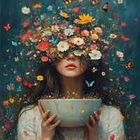 Vlinder Bloem - Dit bloemen schilderij toont een vrouw met een rijke bloemenkrans als hoed, vol met kleurrijke bloemen en fladderende vlinders eromheen, terwijl ze een kom vasthoudt waaruit kleine bloemen en lichtpunten opstijgen.