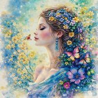 Dit werk toont een vrouw in een moment van stille focus, waar natuur en identiteit naadloos samenvloeien. Bloemen en vlinders vormen geen decor, maar een verlengstuk van haar innerlijke wereld. De zachte aquarelkleuren en vloeiende overgangen geven het beeld een lichte, bijna zwevende kwaliteit. Het portret gaat over vertraging,…
