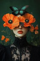 Een surrealistisch portret waar natuur en mode samensmelten in een betoverende compositie. Tegen een diepgroene achtergrond wordt het gezicht gedeeltelijk bedekt door twee weelderige oranje papavers, terwijl verschillende vlinders - waaronder een turquoise exemplaar en oranje monarchvlinders - het beeld complementeren. De figuur draagt een elegante zwarte kanten kraag en heeft sprekende koraalrode lippen die perfect harmoniëren met de bloemen.