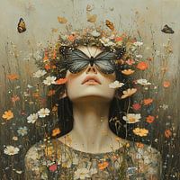 Vlinder Vrouw - Op dit bloemen schilderij zie je een vrouw met een zonnebril in de vorm van een vlinder, omringd door een levendige bloemenkroon en fladderende vlinders op een achtergrond met zachte aardetinten.