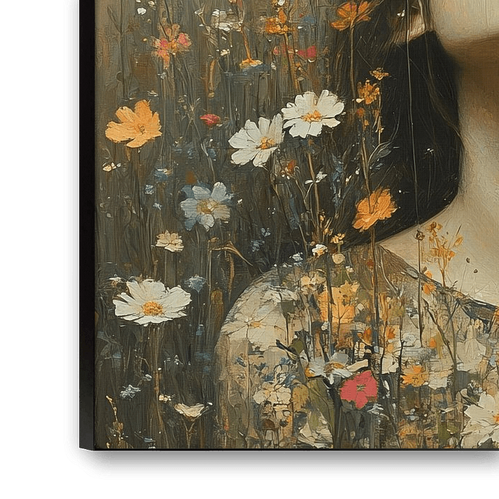 Vlinder Vrouw - Op dit bloemen schilderij zie je een vrouw met een zonnebril in de vorm van een vlinder, omringd door een levendige bloemenkroon en fladderende vlinders op een achtergrond met zachte aardetinten.