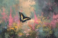 Een vlinder fladdert sierlijk met zijn vleugels over een impressionistische tuin vol wilde bloemen. Zachte pastelkleuren en gestructureerde penseelstreken geven de scène diepte en een dromerige sfeer. De subtiele luchtbewegingen en fijne details creëren een gevoel van rust, harmonie en verwondering. Het olieverfschilderij legt vooral de…