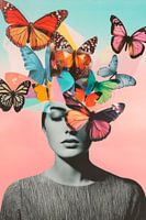 Een zacht moment van transformatie: kleurrijke vlinders ontvouwen hun vleugels en dansen boven een peinzend hoofd. De harmonieuze combinatie van natuur en geest maakt dromen zichtbaar, terwijl geometrische vormen levendige impulsen ensceneren. Het contrast tussen het zwart-witte gezicht en het heldere kleurenspel creëert een…