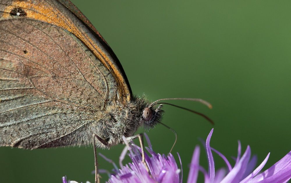 Een vlinder zoekt voedsel op een paarse weidebloem. De achtergrond is groen.