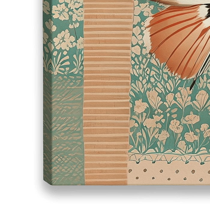 Deze vlinder is gemaakt met fraaie patronen in een retro kleurenstijl. Het warme oranje in combinatie met turquoise en mint groen geeft dit werk een retro look and feel.