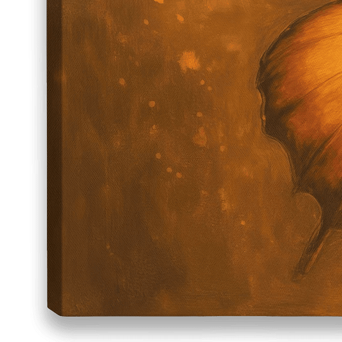 Een grote vlinder spreidt zijn vleugels in het midden van het beeld, omlijst door een warme gloed en subtiele bokeh. De voorvleugels tonen zachte kleurovergangen met donkerder randen, terwijl de achtergrond fluweelachtig en licht nevelig oogt. Dit creëert een rustig contrast tussen het scherpe silhouet en de dromerige diepte. De…
