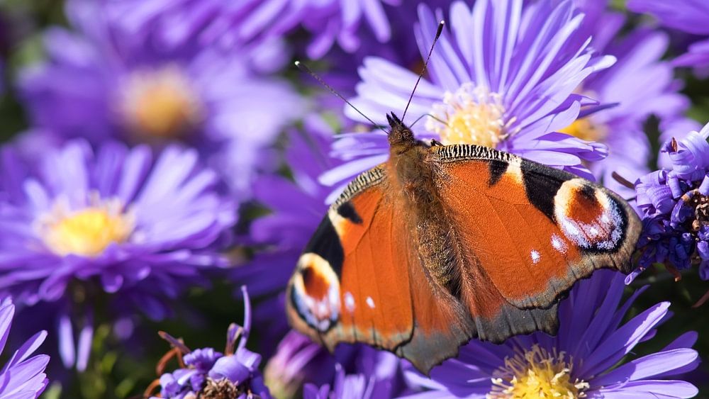 Pauw vlinder op paarse asters