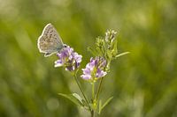 Horizontale foto van een blauwe vlinder op een bloem. De groene achtergrond geeft een erg zomerse sfeer aan de foto. Op de achtergrond is nog wat bokeh zichtbaar wat een dromerig effect geeft.