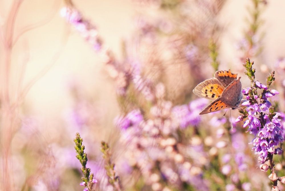 Foto van een vlindertje op de heide. Om de heide beter in beeld te brengen heb ik geen close-up van de vlinder gemaakt, maar ook meer van de achtergrond op de foto gezet. Ik heb de foto nabewerkt in Affinity Photo. Hier heb ik de kleuren iets aangepast. De warme gloed en warme kleuren geven een zomers effect.